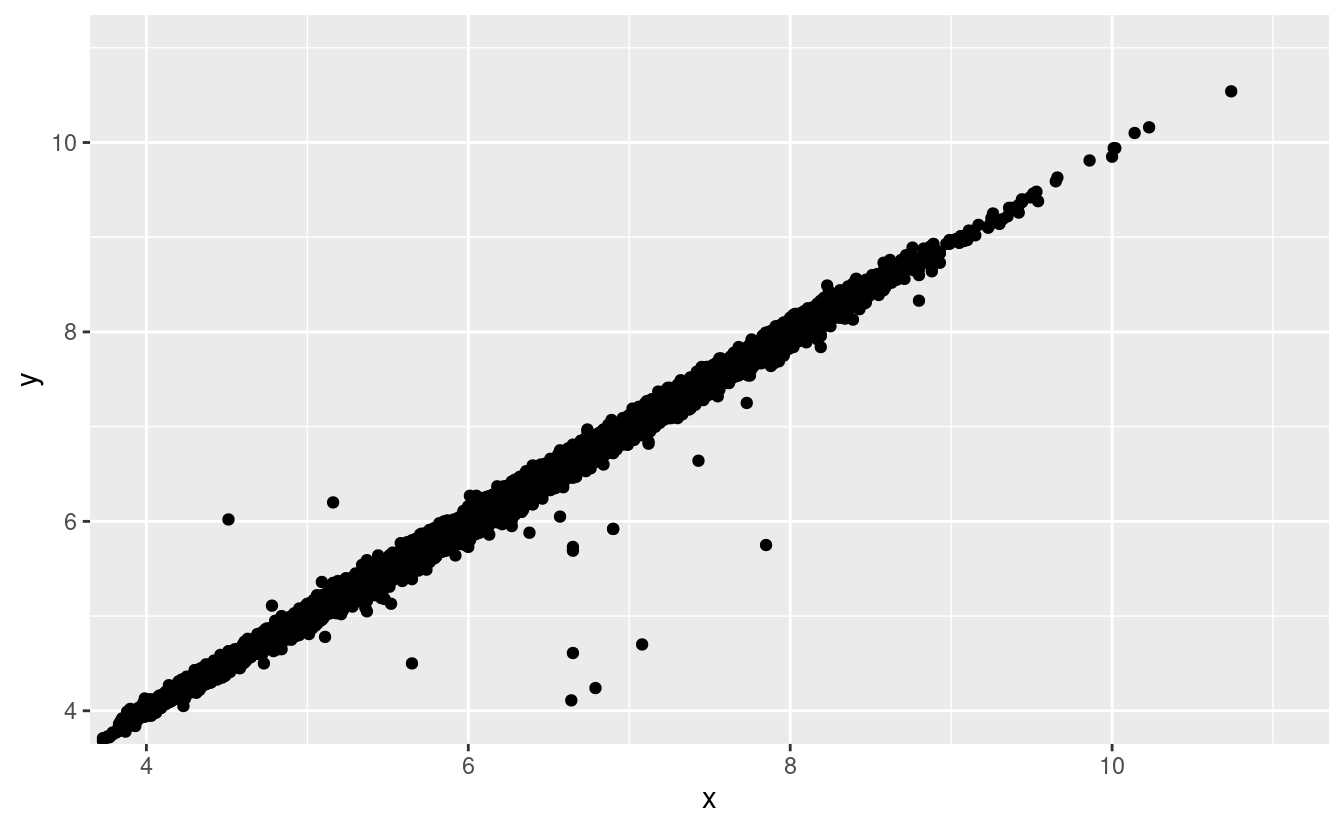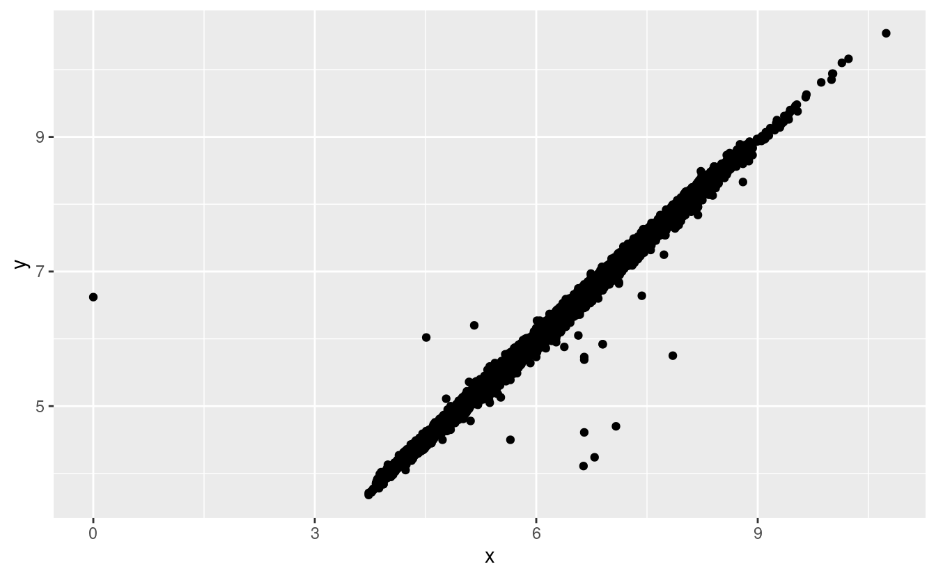 xey, che rende i punti anomali anche se i loro valorixeysembrano normali se esaminati separatamente.ggplot(data = diamonds) + geom_point(mapping = aes(x = x, y = y)) + coord_cartesian(xlim = c(4, 11), ylim = c(4, 11))