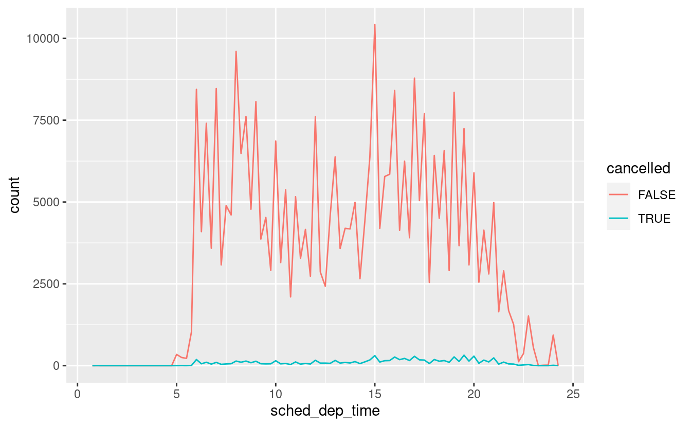 geom_tile()insieme a dplyr per esplorare come i ritardi medi dei voli per la destinazione e il mese dell’anno. Cosa rende il difficile da leggere? Come potreste migliorarlo?Perché è leggermente meglio usare