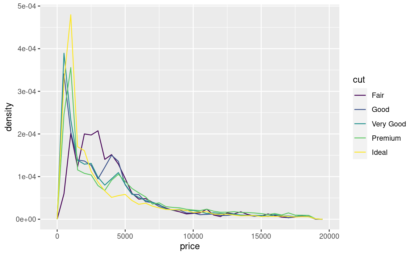 Se vuoi sovrapporre più istogrammi nello stesso grafico, ti consiglio di usare geom_freqpoly() invece di geom_histogram(). La funzione geom_freqpoly() esegue lo stesso calcolo di geom_histogram(), ma invece di visualizzare i conteggi con delle barre, utilizza delle linee. È molto più facile capire le linee sovrapposte rispetto alle barre.