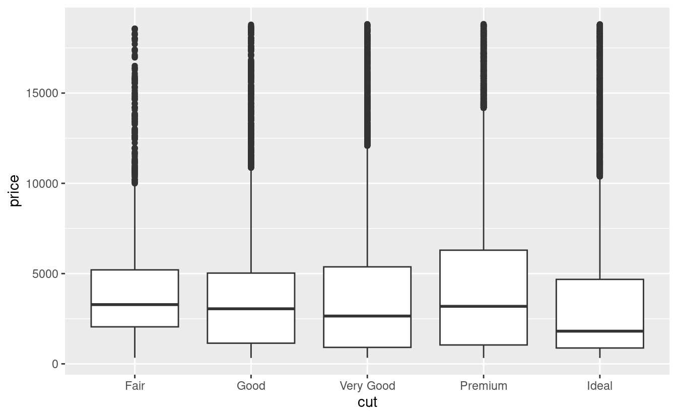 Il taglio è un fattore ordinato: giusto è peggiore di buono, che è peggiore di molto buono e così via. Molte variabili categoriche non hanno un tale ordine intrinseco, quindi potreste volerle riordinare per fare una visualizzazione più informativa. Un modo per farlo è con la funzione reorder().
