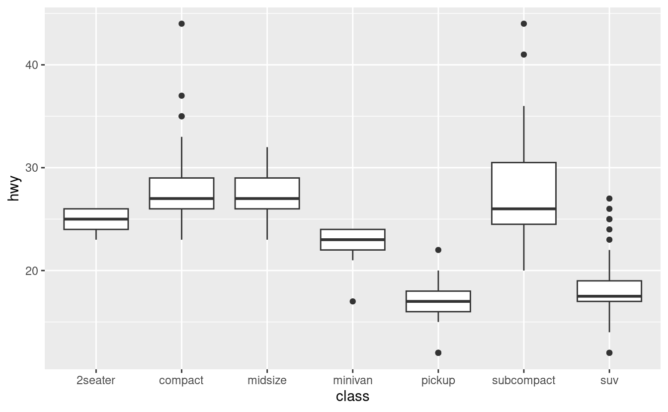 ggplot(data = mpg, mapping = aes(x = class, y = hwy)) +