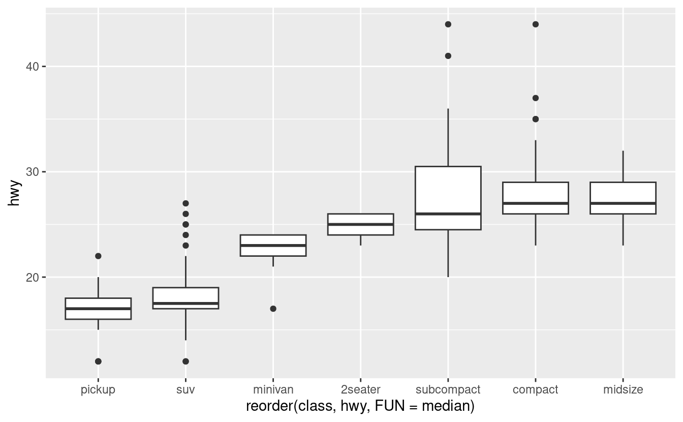 geom_boxplot(mapping = aes(x = reorder(class, hwy, FUN = median), y = hwy)) +