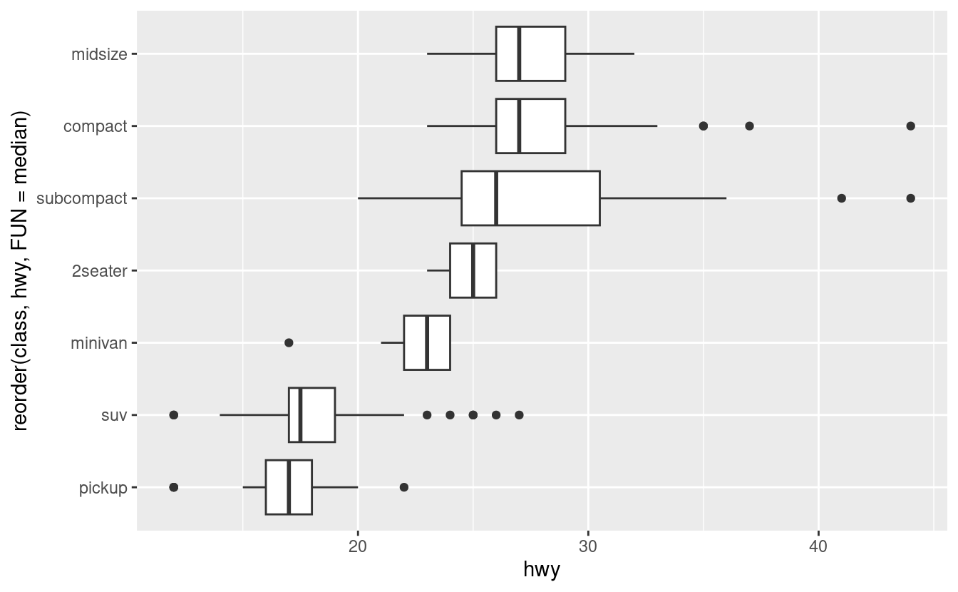 Per rendere la tendenza più facile da vedere, possiamo riordinare la classe in base al valore mediano di hwy: