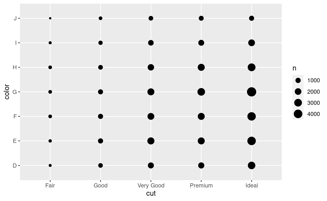 Per visualizzare la covariazione tra variabili categoriche, avrete bisogno di contare il numero di osservazioni per ogni combinazione. Un modo per farlo è affidarsi al built-in geom_count():