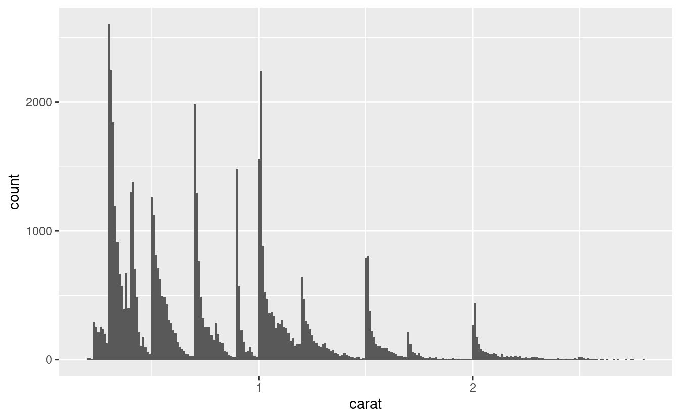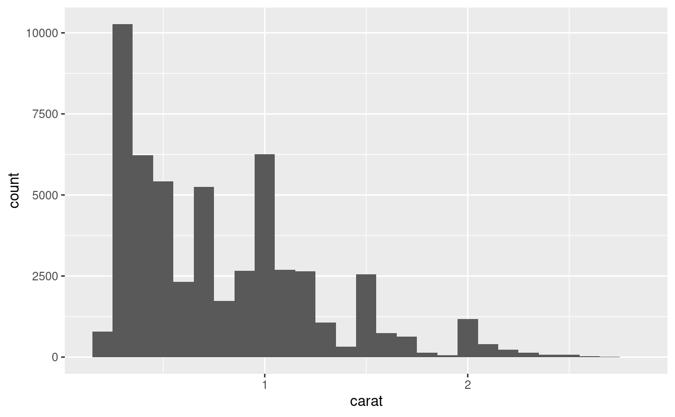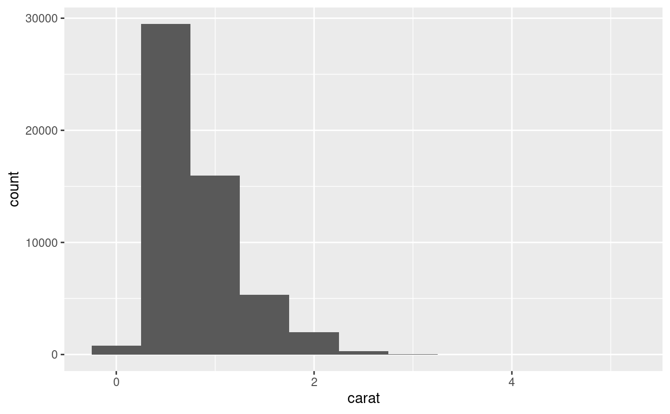 #> # … with 5 more rowsUn istogramma divide l’asse x in intervalli equamente distanziati e poi usa l’altezza di una barra per mostrare il numero di osservazioni che rientrano in ciascun intervallo. Nel grafico qui sopra, la barra più alta mostra che quasi 30.000 osservazioni hanno un valore di carat tra 0,25 e 0,75, che sono i bordi sinistro e destro della barra.