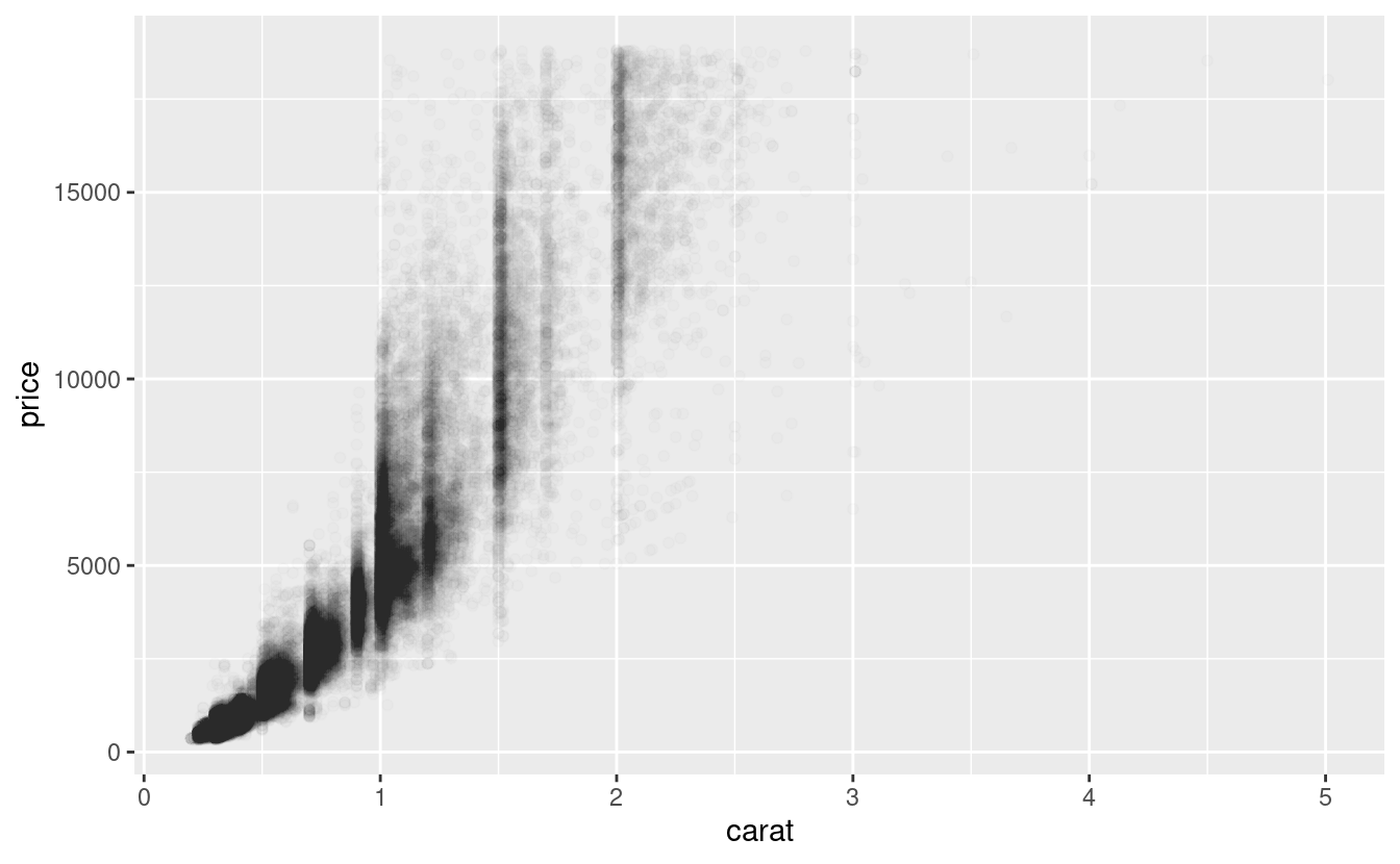 geom_point(mapping = aes(x = carat, y = price), alpha = 1 / 100)