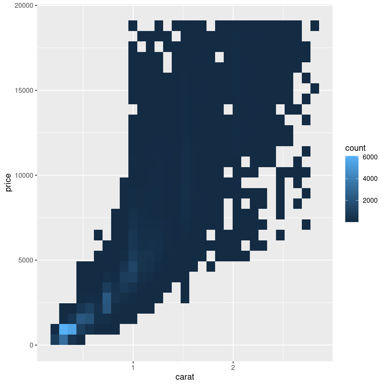 geom_bin2d(mapping = aes(x = carat, y = price))
