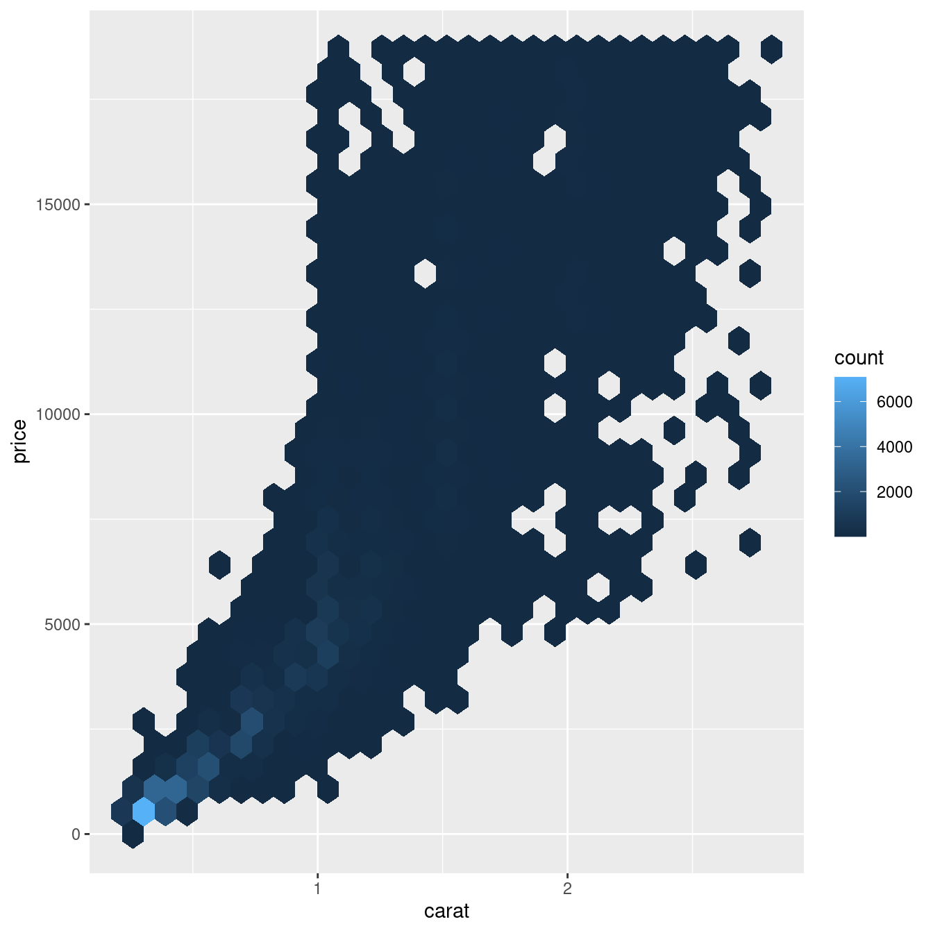 geom_hex(mapping = aes(x = carat, y = price))