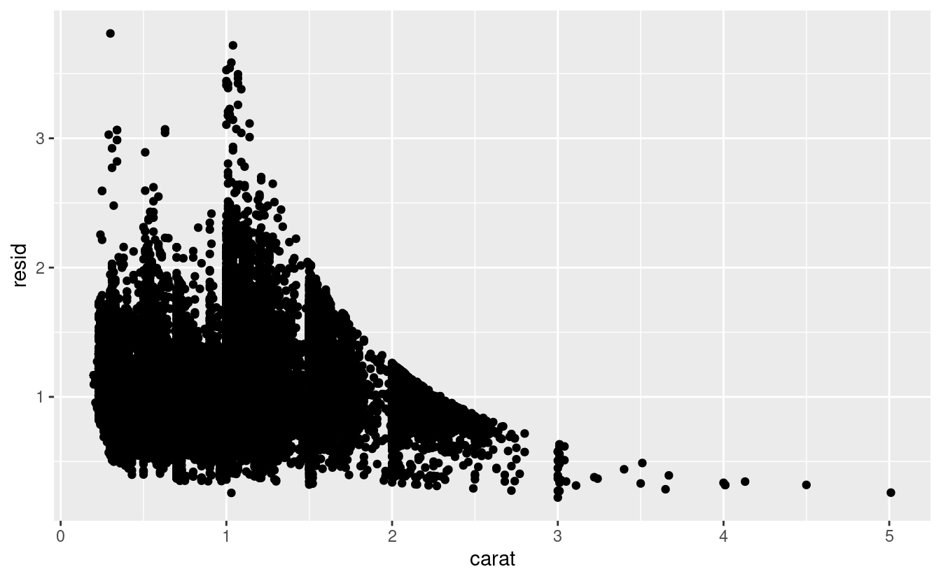 I modelli sono uno strumento per estrarre modelli dai dati. Per esempio, considerate i dati sui diamanti. È difficile capire la relazione tra taglio e prezzo, perché taglio e carato, e carato e prezzo sono strettamente correlati. È possibile utilizzare un modello per rimuovere la relazione molto forte tra prezzo e carato in modo da poter esplorare le sottigliezze che rimangono. Il codice seguente adatta un modello che predice il price dal carat e poi calcola i residui (la differenza tra il valore predetto e il valore reale). I residui ci danno una visione del prezzo del diamante, una volta rimosso l’effetto della caratura.