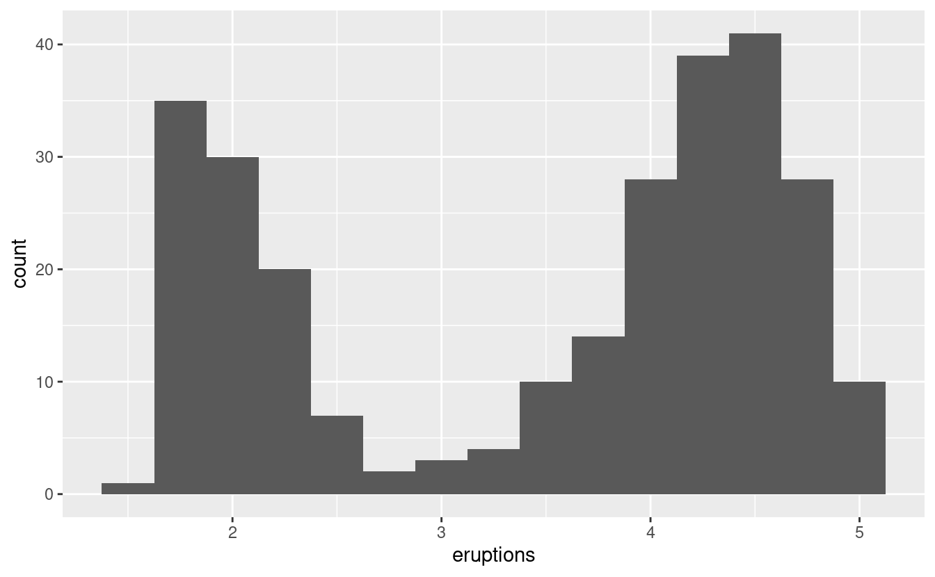 ggplot(data = faithful, mapping = aes(x = eruptions)) +