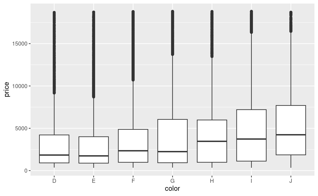 ggplot(diamonds, aes(color, price)) + geom_boxplot()