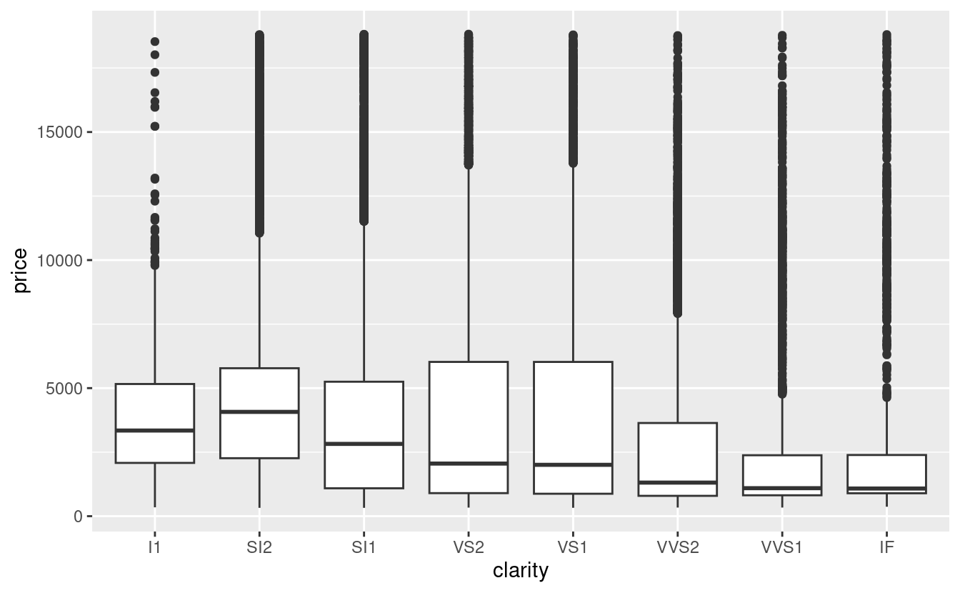 ggplot(diamonds, aes(clarity, price)) + geom_boxplot()