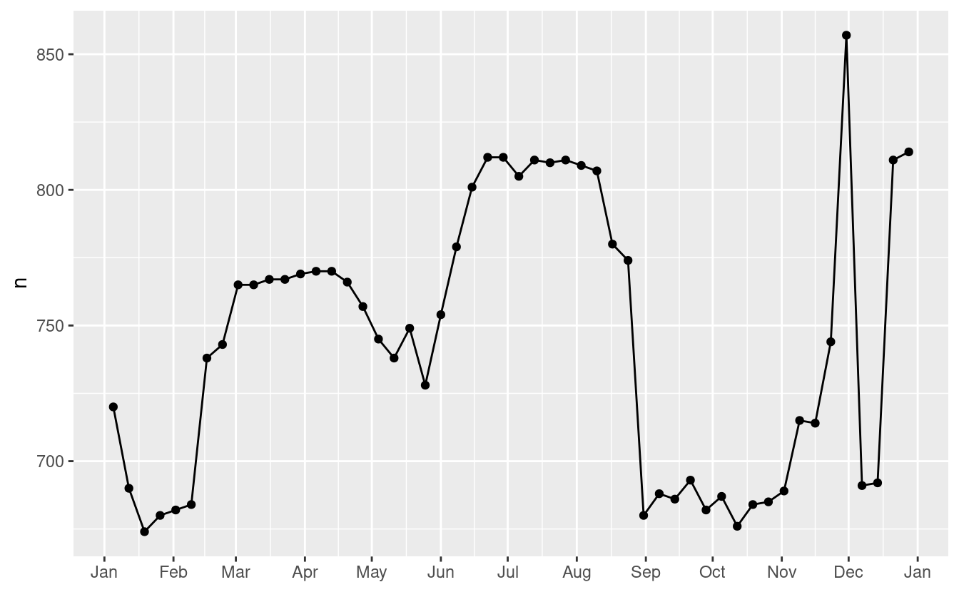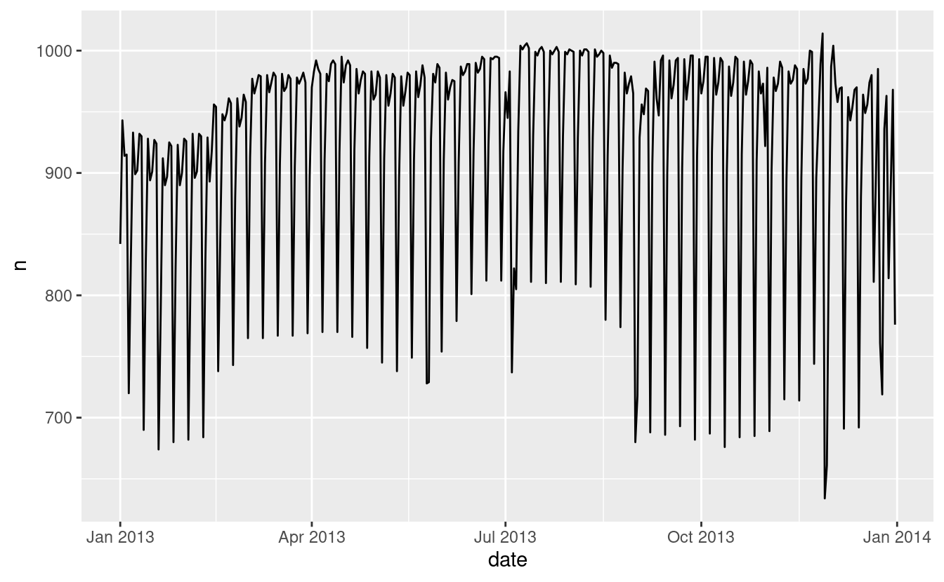Lavoriamo attraverso un processo simile per un set di dati che sembra ancora più semplice a prima vista: il numero di voli che lasciano NYC al giorno. Questo è un dataset davvero piccolo — solo 365 righe e 2 colonne — e non finiremo con un modello completamente realizzato, ma come vedrete, i passi lungo il percorso ci aiuteranno a capire meglio i dati. Iniziamo contando il numero di voli al giorno e visualizzandolo con ggplot2.