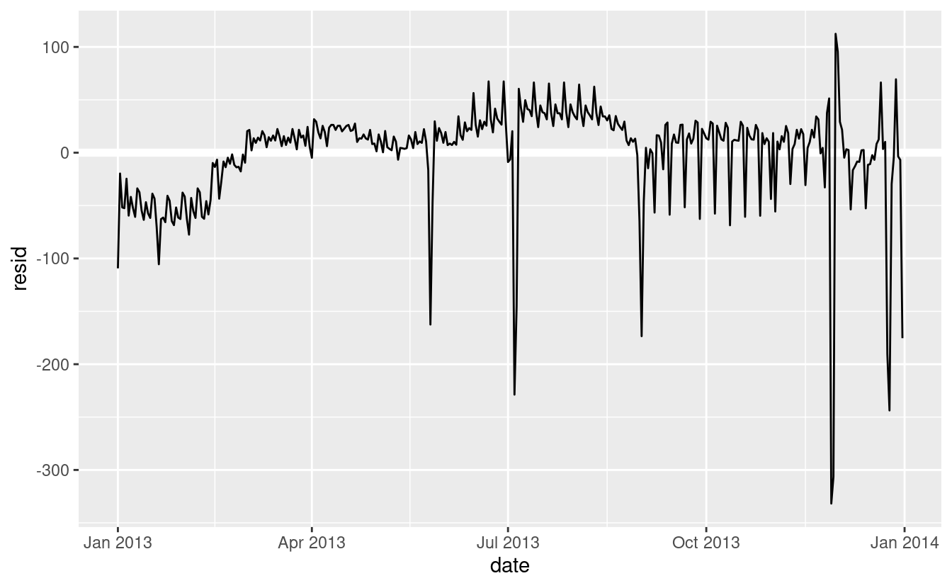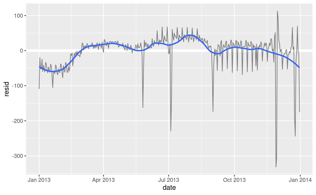 Il nostro modello sta trovando l’effetto mean, ma abbiamo molti grandi outlier, quindi la media tende ad essere molto lontana dal valore tipico. Possiamo alleviare questo problema usando un modello che è robusto all’effetto degli outlier: MASS::rlm(). Questo riduce notevolmente l’impatto degli outlier sulle nostre stime e fornisce un modello che fa un buon lavoro per rimuovere il modello del giorno della settimana: