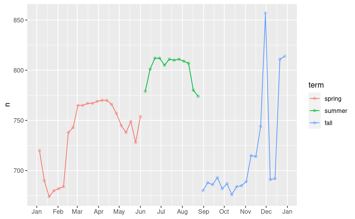 ggplot(aes(wday, n, colour = term)) +