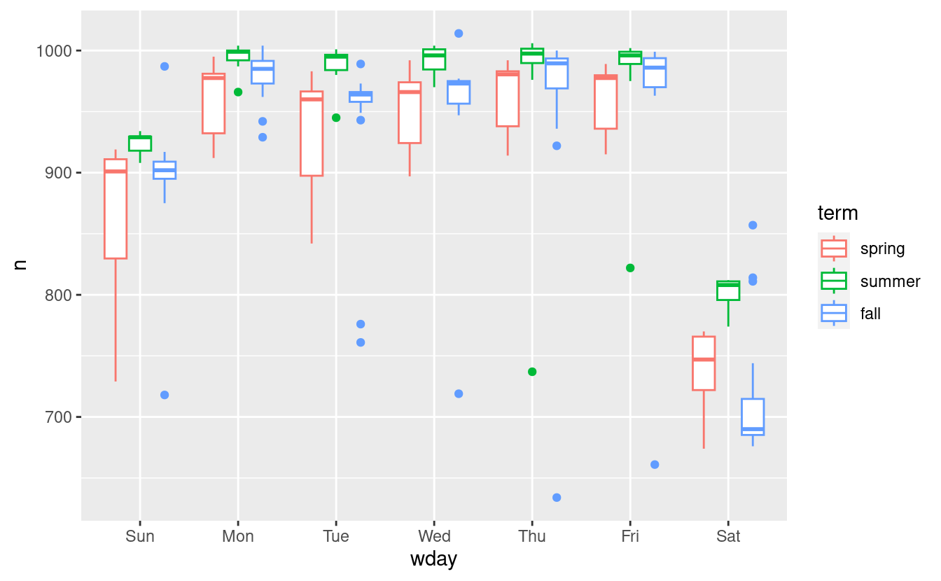 mod3 <- MASS::rlm(n ~ wday * term, data = daily)