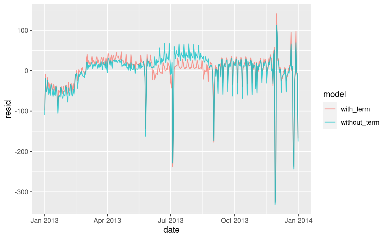 Sembra che ci sia una variazione significativa tra i termini, quindi è ragionevole inserire un effetto separato del giorno della settimana per ogni termine. Questo migliora il nostro modello, ma non così tanto come potremmo sperare: