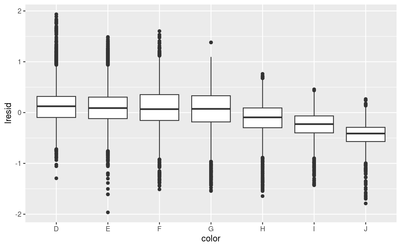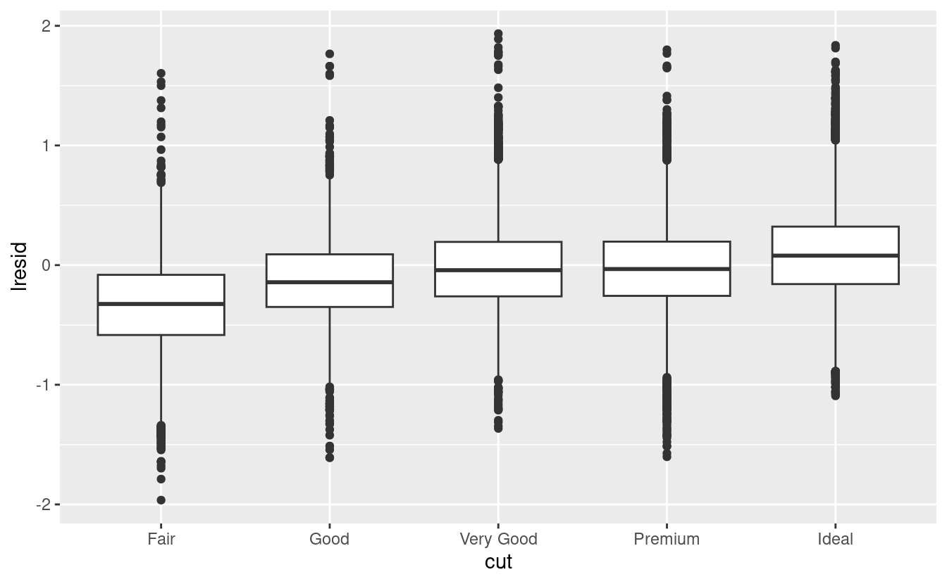 Ora vediamo la relazione che ci aspettiamo: man mano che la qualità del diamante aumenta, aumenta anche il suo prezzo relativo. Per interpretare l’asse y, dobbiamo pensare a cosa ci dicono i residui e su quale scala si trovano. Un residuo di -1 indica che lprice è stato 1 unità più basso di una previsione basata solo sul suo peso. \(2^{-1}\) è 1/2, i punti con un valore di -1 sono la metà del prezzo previsto, e i residui con valore 1 sono il doppio del prezzo previsto.