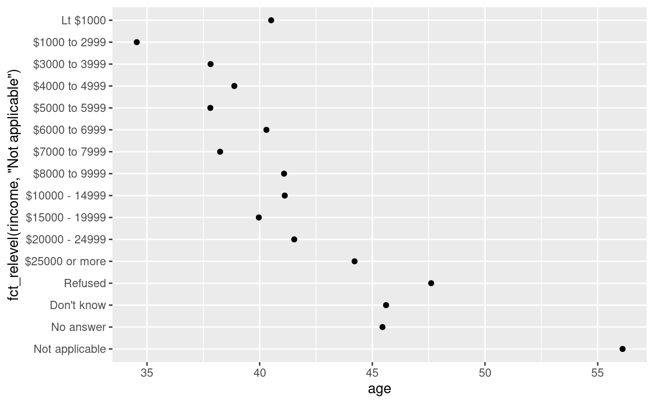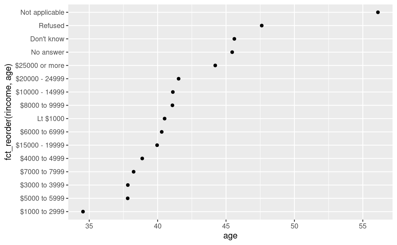 Qui, riordinare arbitrariamente i livelli non è una buona idea! Questo perché rincome ha già un ordine di principio con cui non dovremmo scherzare. Riservate fct_reorder() ai fattori i cui livelli sono ordinati arbitrariamente.