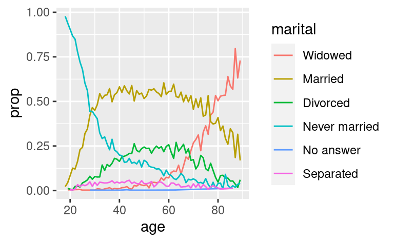 ggplot(by_age, aes(age, prop, colour = fct_reorder2(marital, age, prop))) +