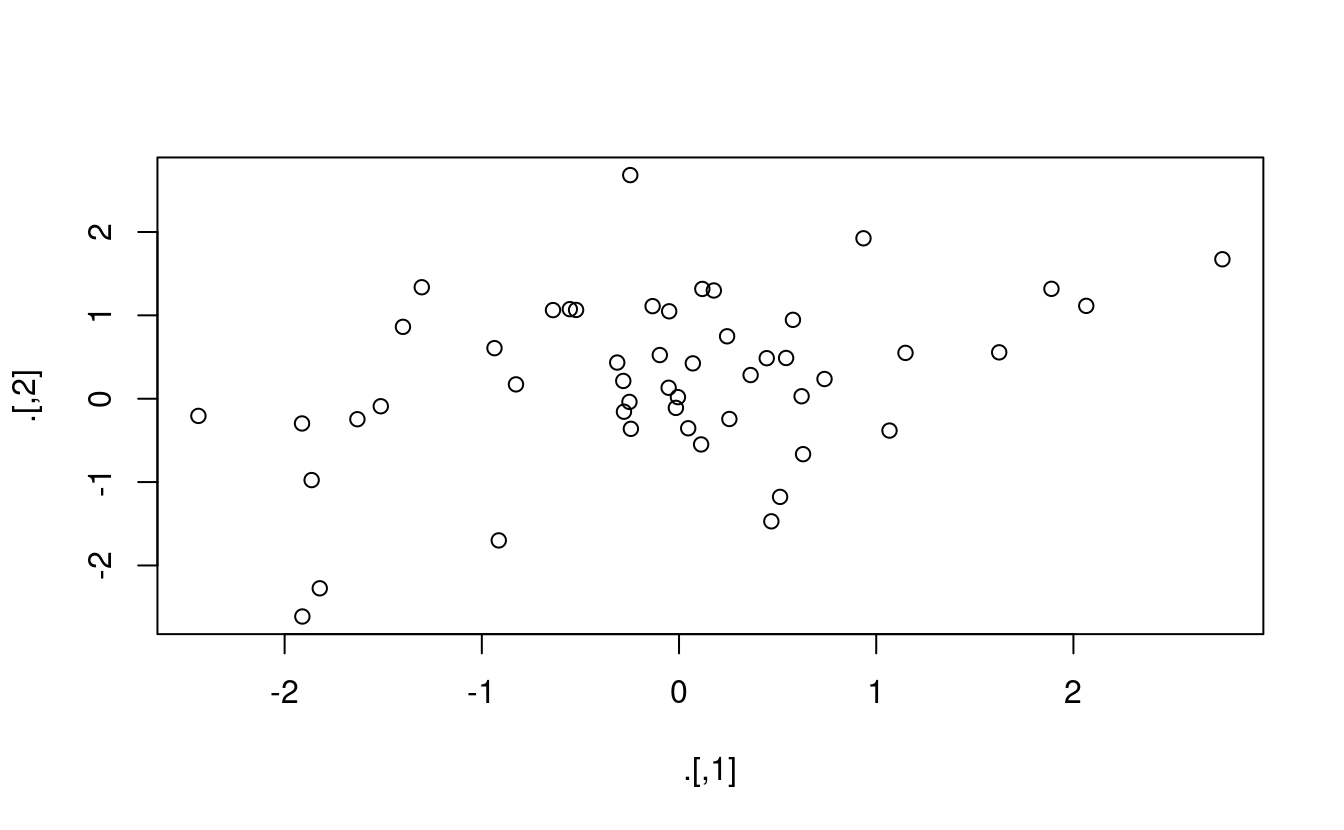 %T>%funziona come%>%eccetto che restituisce il lato sinistro invece del lato destro lato destro. Si chiama “tee” perché è come un tubo letterale a forma di T.rnorm(100) %>% matrix(ncol = 2) %>% plot() %>% str() #> NULL rnorm(100) %>% matrix(ncol = 2) %T>% plot() %>% str() #> num [1:50, 1:2] -0.387 -0.785 -1.057 -0.796 -1.756 ...