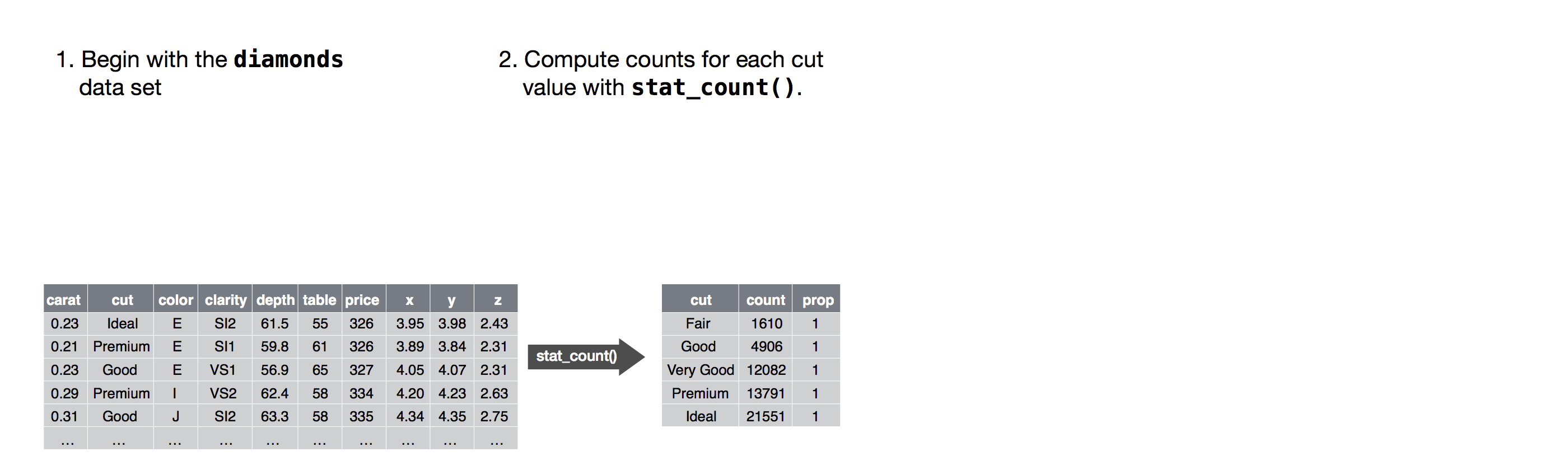Per vedere come funziona, considerate come potreste costruire una grafico di base da zero: potreste iniziare con un set di dati e poi trasformarlo nelle informazioni che volete visualizzare (con una stat).