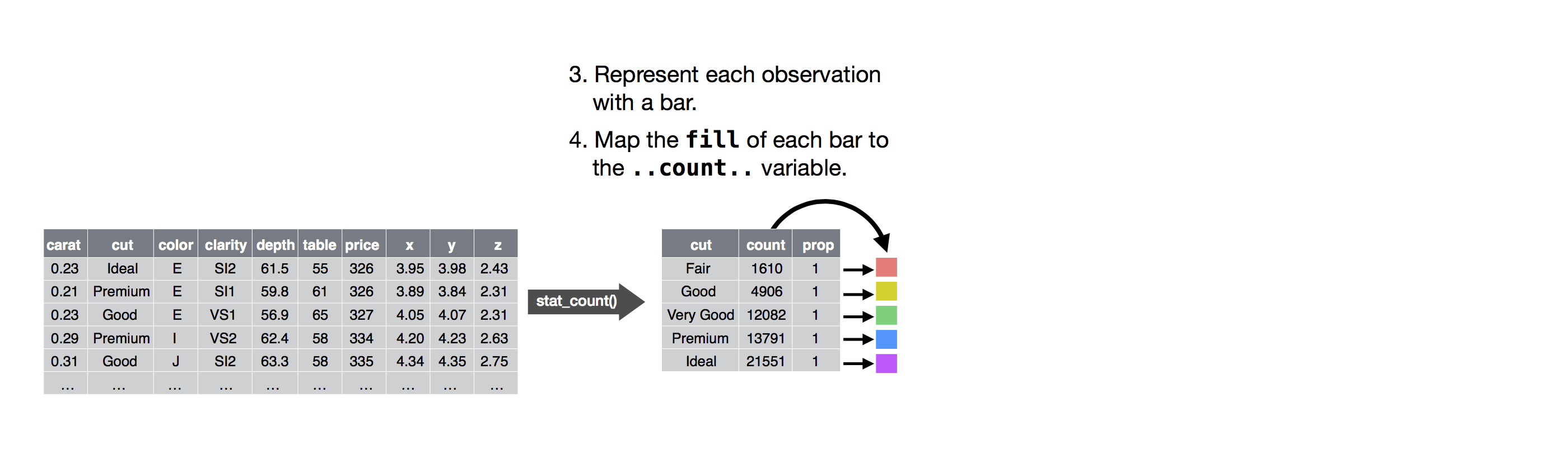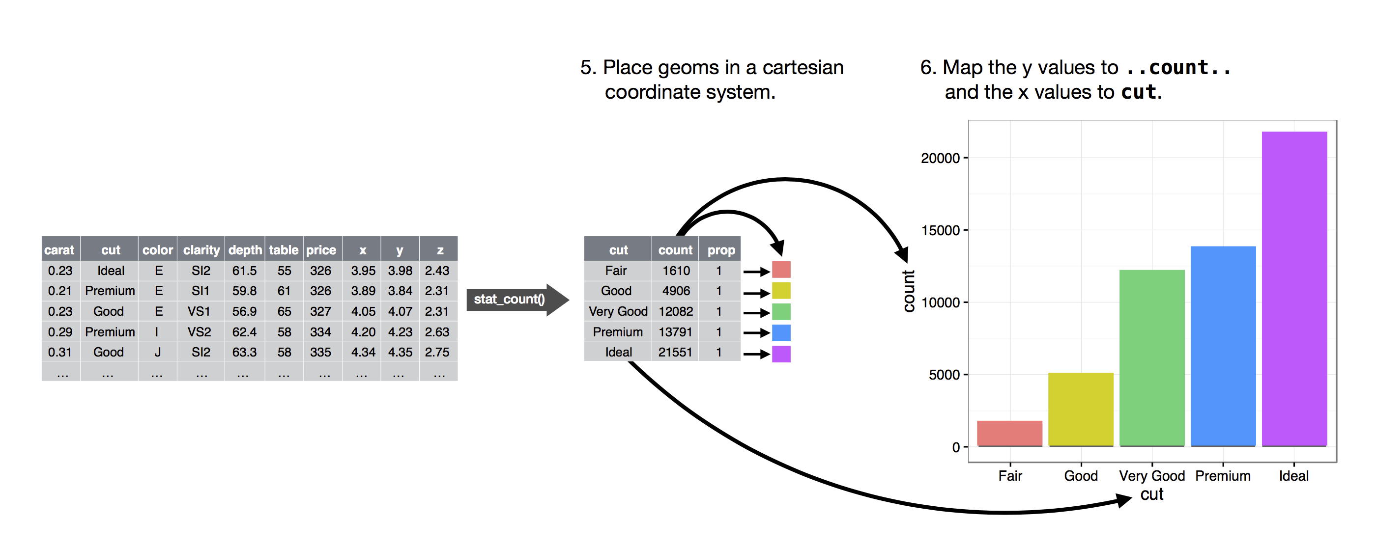L’algoritmo usato per calcolare nuovi valori per un grafico è chiamato stat, abbreviazione di trasformazione statistica. La figura sottostante descrive come funziona questo processo con geom_bar().