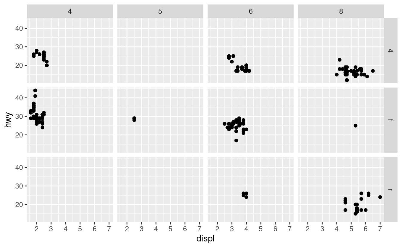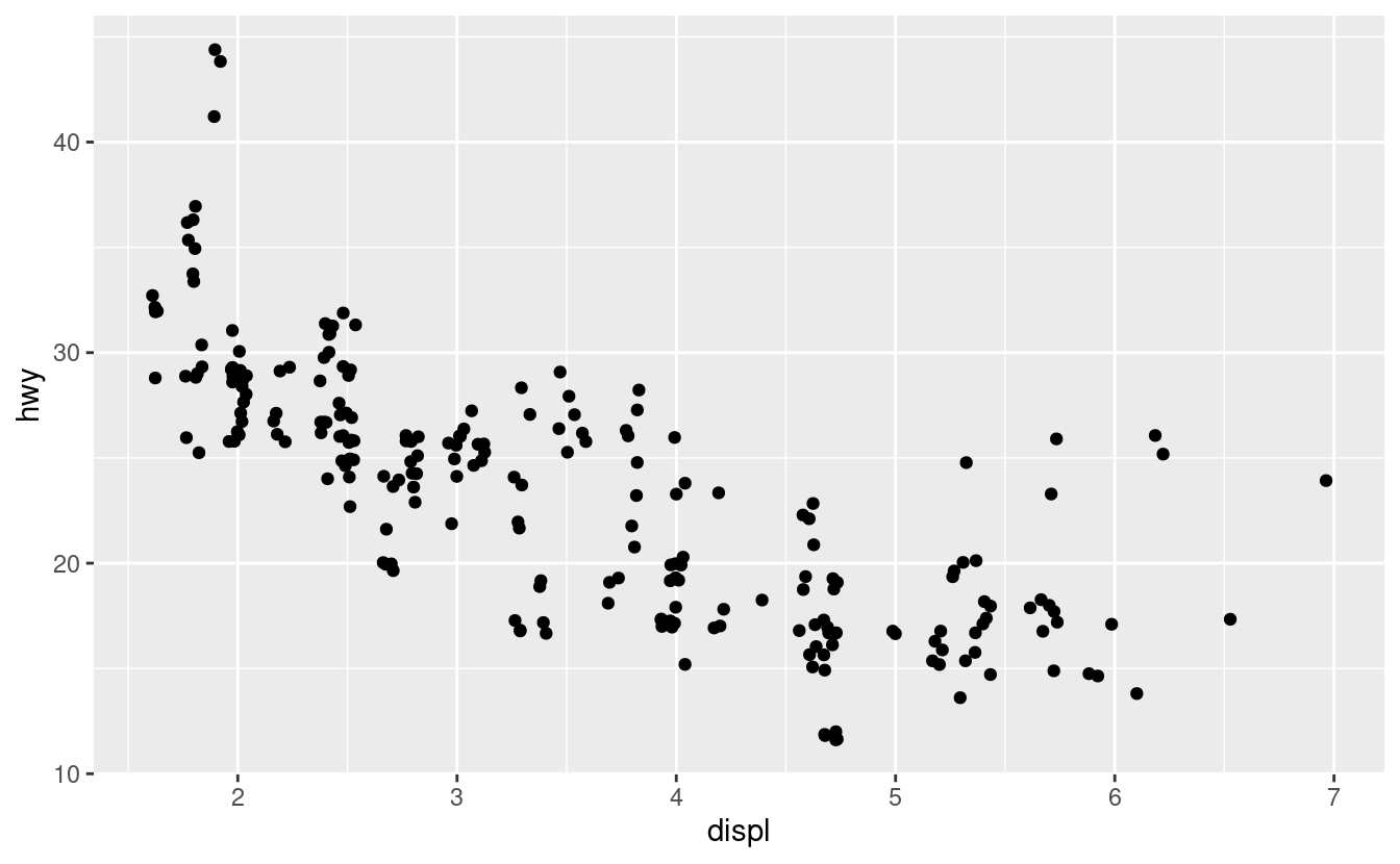 ggplot(data = mpg, mapping = aes(x = displ, y = hwy)) +
