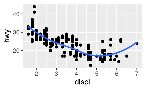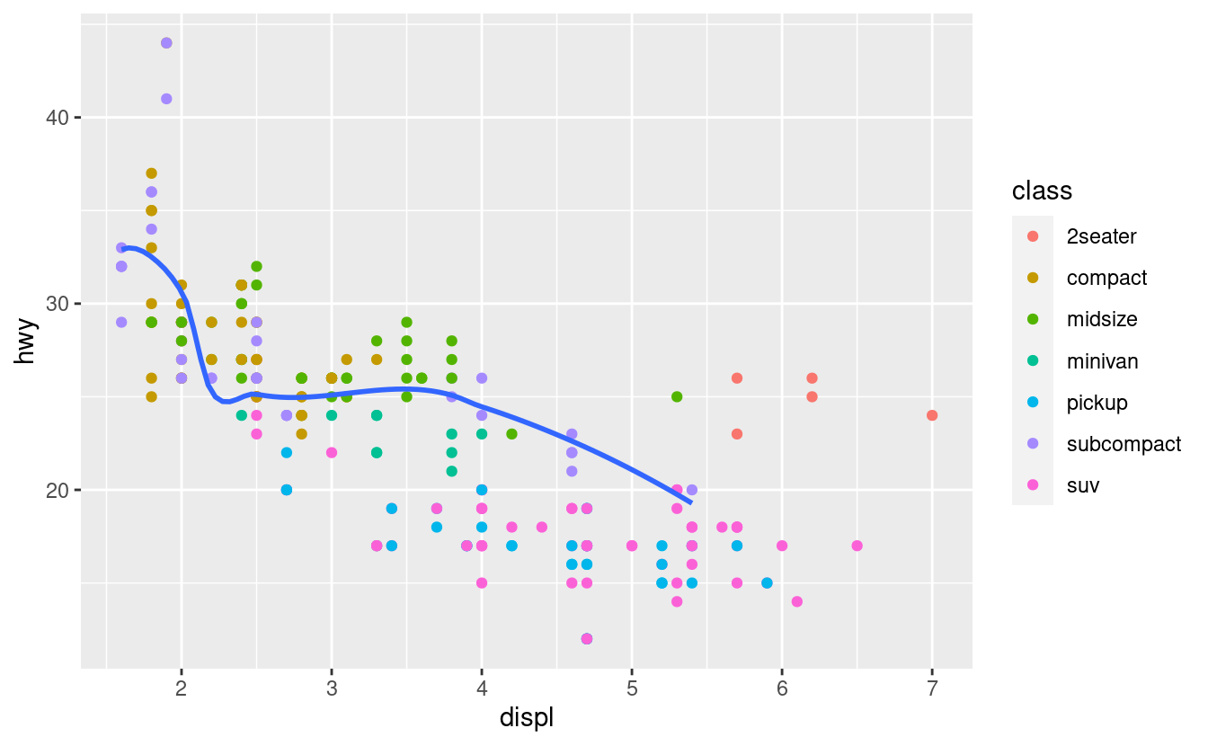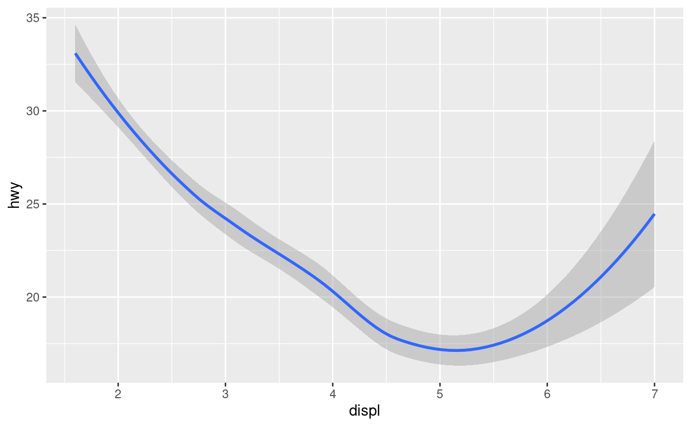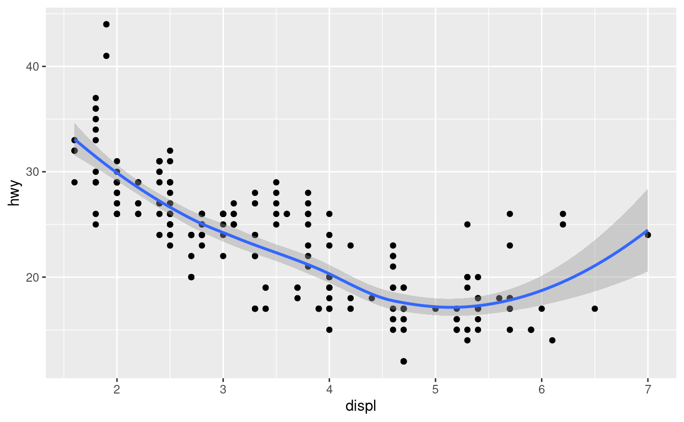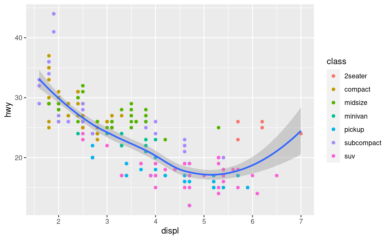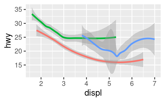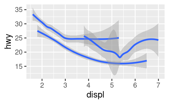 ggplot(data = mpg, mapping = aes(x = displ, y = hwy)) + geom_point() + geom_smooth() ggplot() + geom_point(data = mpg, mapping = aes(x = displ, y = hwy)) + geom_smooth(data = mpg, mapping = aes(x = displ, y = hwy)) -