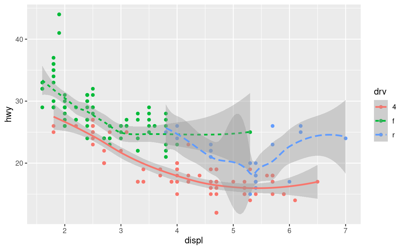 geom_smooth()Se si inseriscono mappature in una funzione geom, ggplot2 le tratterà come mappature locali per il livello. Userà queste mappature per estendere o sovrascrivere le mappature globali per quel solo livello. Questo rende possibile la visualizzazione di diverse estetiche in diversi livelli.