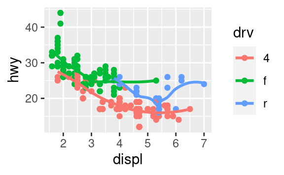 ggplot(data = mpg, mapping = aes(x = displ, y = hwy, color = drv)) + geom_point() + geom_smooth(se = FALSE) Cosa fa