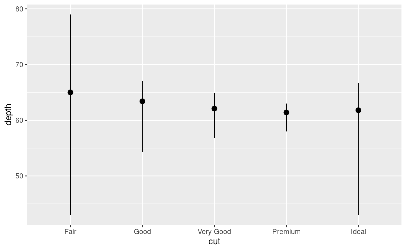 stat_summary(), che riassume i valori y per ogni unico valore x, per attirare l’attenzione sul sommario che state calcolando:ggplot(data = diamonds) + stat_summary( mapping = aes(x = cut, y = depth), fun.min = min, fun.max = max, fun = median )