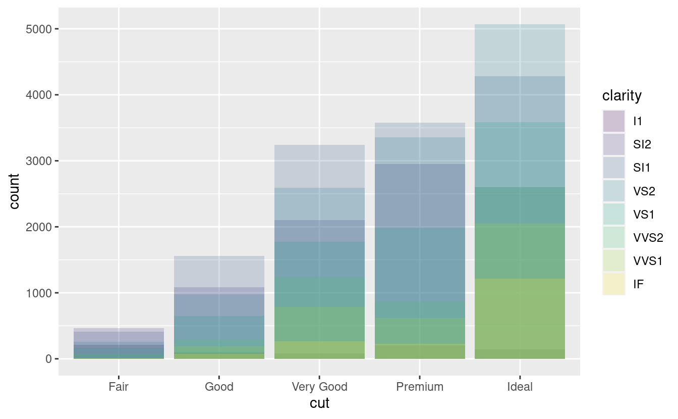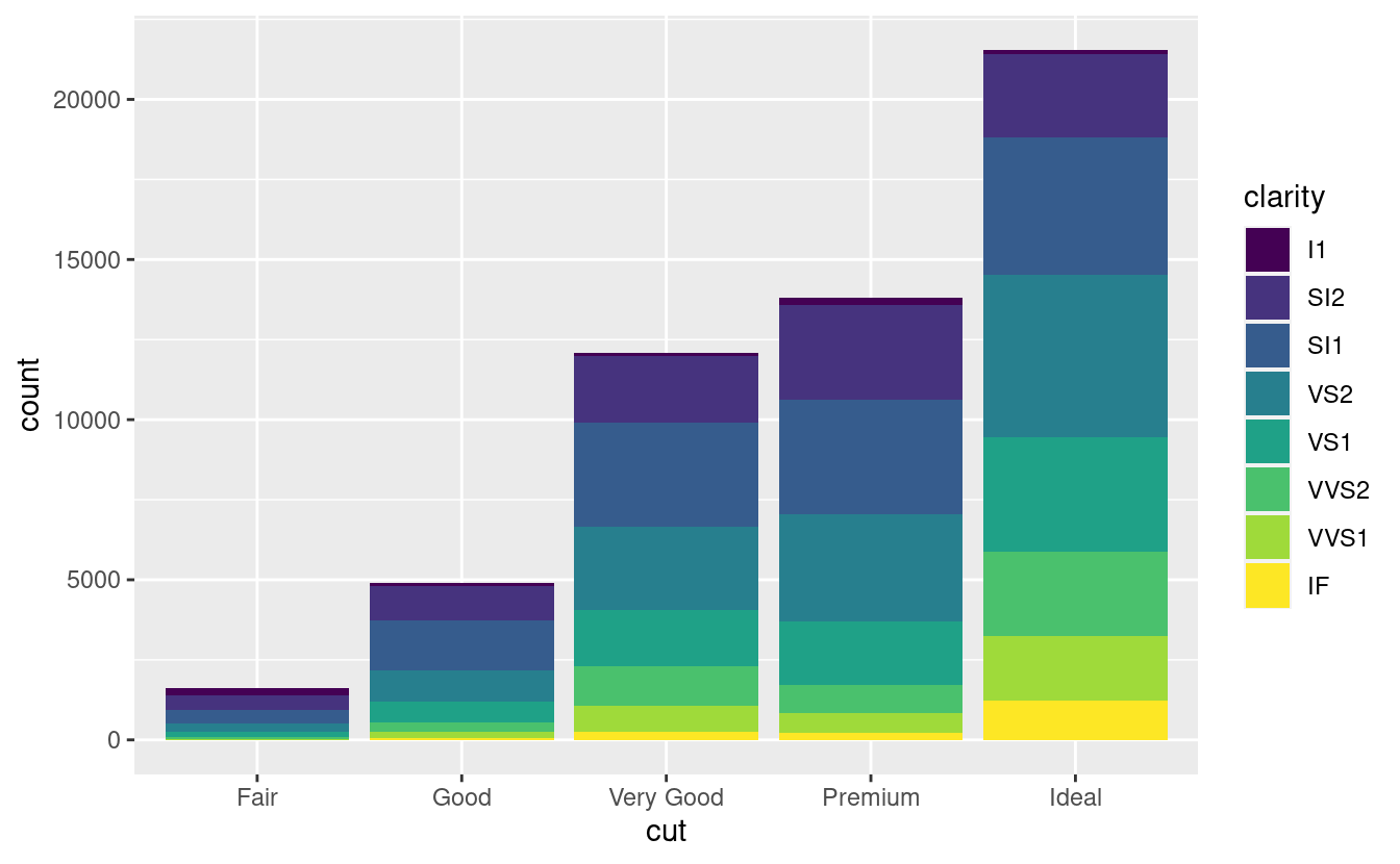 Notate cosa succede se si mappa l’estetica di riempimento ad un’altra variabile, come clarity: le barre sono automaticamente impilate. Ogni rettangolo colorato rappresenta una combinazione di cut e clarity.
