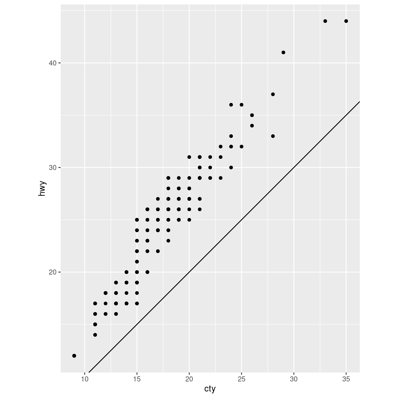 ggplot(data = mpg, mapping = aes(x = cty, y = hwy)) + geom_point()