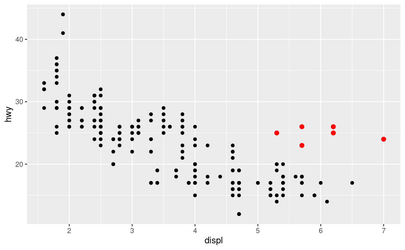 aes(colour = displ < 5)? Nota, dovrai anche specificare x e y.