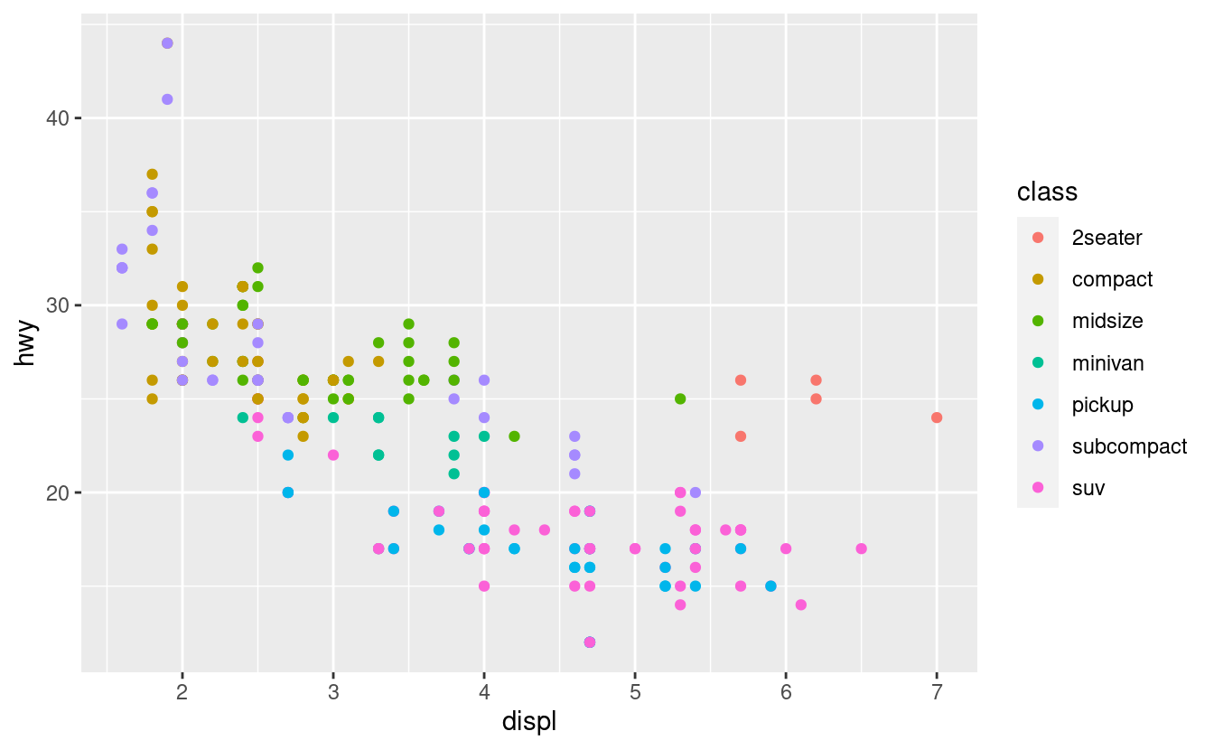 geom_point(mapping = aes(x = displ, y = hwy, color = class))