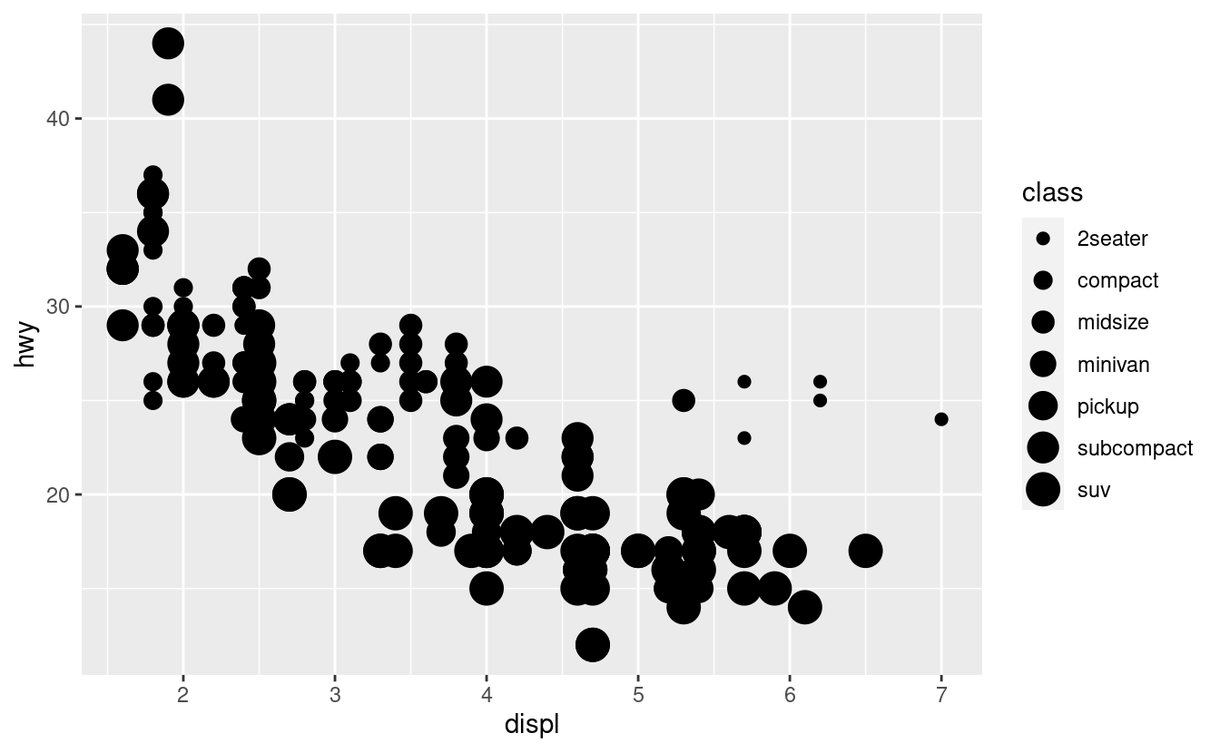 geom_point(mapping = aes(x = displ, y = hwy, size = class))