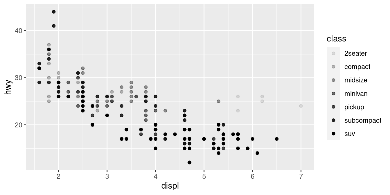 geom_point(mapping = aes(x = displ, y = hwy, alpha = class))