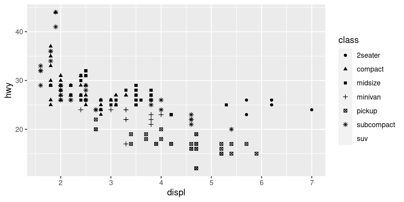 geom_point(mapping = aes(x = displ, y = hwy, shape = class))