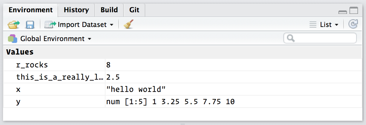 #> [1] 1.00 3.25 5.50 7.75 10.00Ora guarda il tuo environment (‘ambiente di lavoro’) nel riquadro in alto a destra: